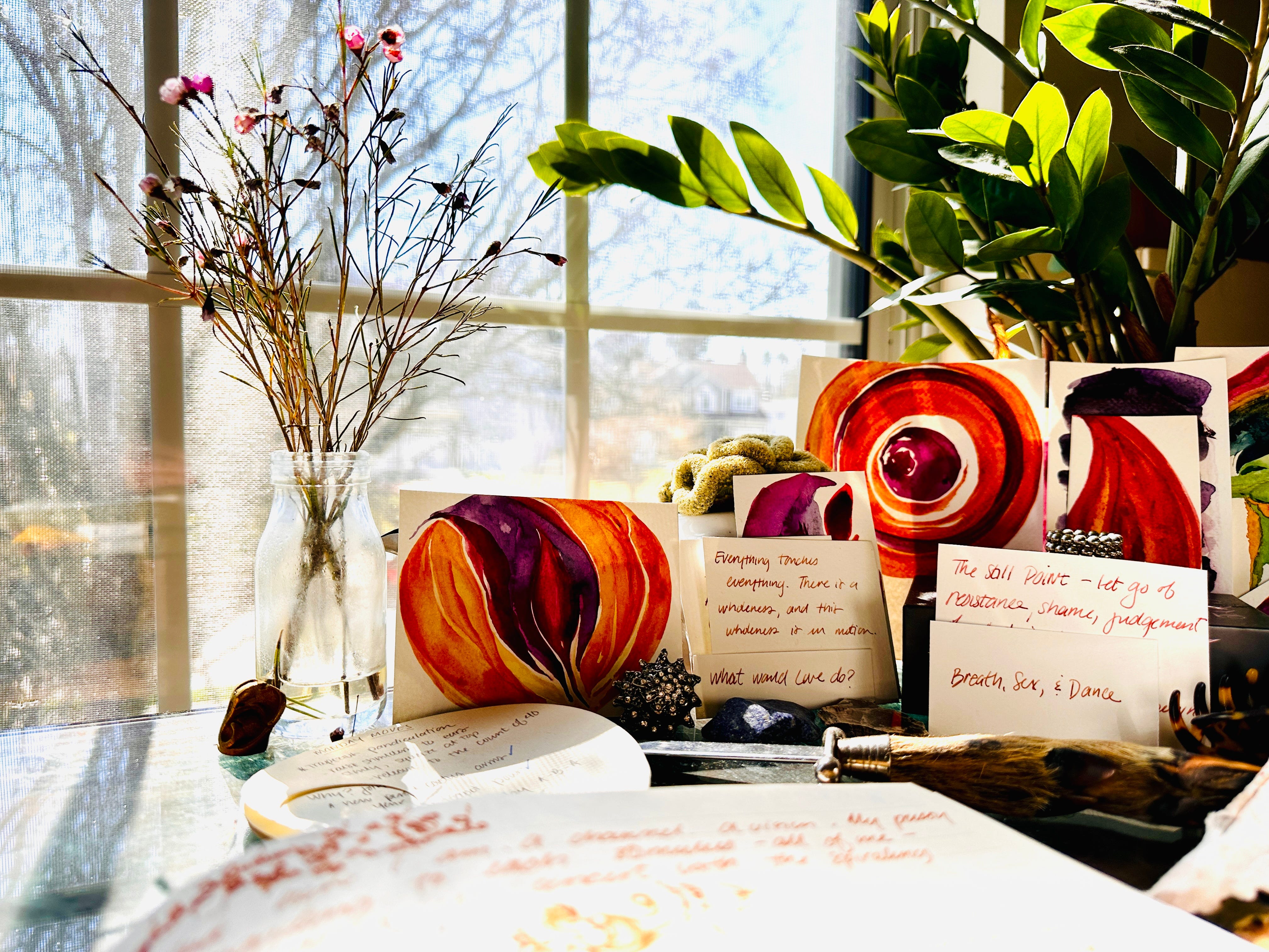 A grey morning and yellow daffodils, a slick terra cotta pot nestled in damp soil beneath the budding tree, birdsongs, cawing, echoing through windows. A thick white mug with orange lining, the words, “TEA with honey,” coffee inside it, warmth on my tongue, my fingers, cinnamon and bittersweetness. A chill on my bare skin, gooesbumps beneath fire engine red spandex, the rising of my spine, the pop of a vertebra. A small square of paper: ”movement ∞ emotion.” Small squares of paper everywhere. Contraction, release, spiraling. Breath, sex & dance. What would love do? Everything touches everything, there is a wholeness, this wholeness is in motion. Even the ether trembles; all parts of the web quivering. In waves, in ripples, in harmony, in space. A quaking mess of sensitivity. A bunch of delicate flowers arranged in a small milk jar respond to the bouncing weight of my writing hand. The budding tree bobbing its limbs responding “yes,” to the wind. And here I am, responding to each rhythmic stimulus part of the chorus in concert with the spiraling universe.