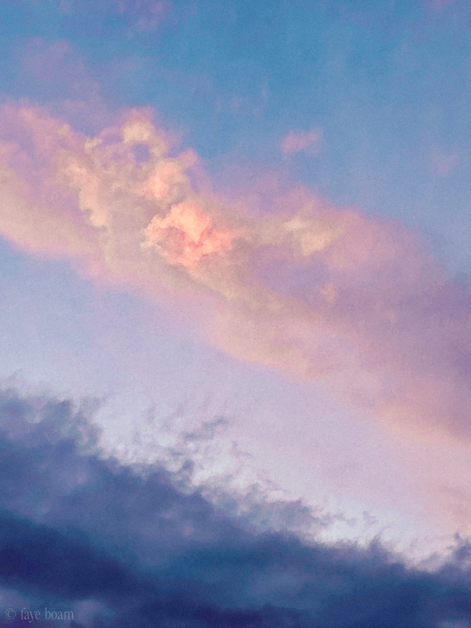 we talked about alice in wonderland a couple days ago. i think of how i’ve been shaped by all the rabbit holes i’ve climbed down. i send him a photo of impossibly soft pink clouds in a sea of blue gradients. does he know it’s a self portrait? me, wrapped in his presence.