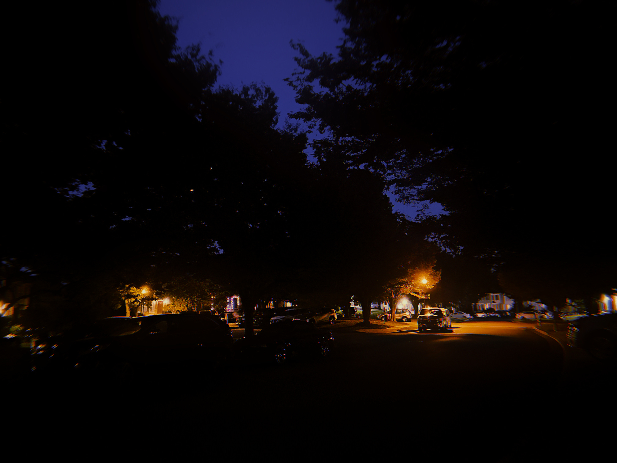 Lamps glow a hazy orange across the empty street.