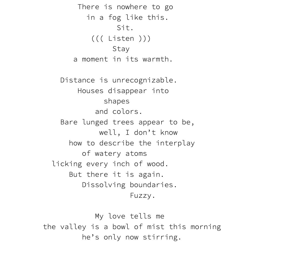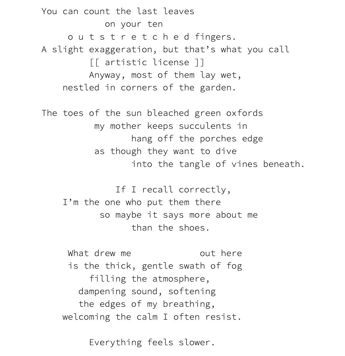 You can count the last leaves on your ten o u t s t r e t c h e d fingers. A slight exaggeration, but that’s what you call [[ artistic license ]] Anyway, most of them lay wet, nestled in corners of the garden. The toes of the sun bleached green oxfords my mother keeps succulents in hang off the porches edge as though they want to dive into the tangle of vines beneath. If I recall correctly, I’m the one who put them there so maybe it says more about me than the shoes. What drew me out here is the thick, gentle swath of fog filling the atmosphere, dampening sound, softening the edges of my breathing, welcoming the calm I often resist. Everything feels slower. There is nowhere to go in a fog like this. Sit. ((( Listen ))) Stay a moment in its warmth. Distance is unrecognizable. Houses disappear into shapes and colors. Bare lunged trees appear to be, well, I don’t know how to describe the interplay of watery atoms licking every inch of wood. But there it is again. Dissolving boundaries. Fuzzy. My love tells me the valley is a bowl of mist this morning he’s only now stirring.