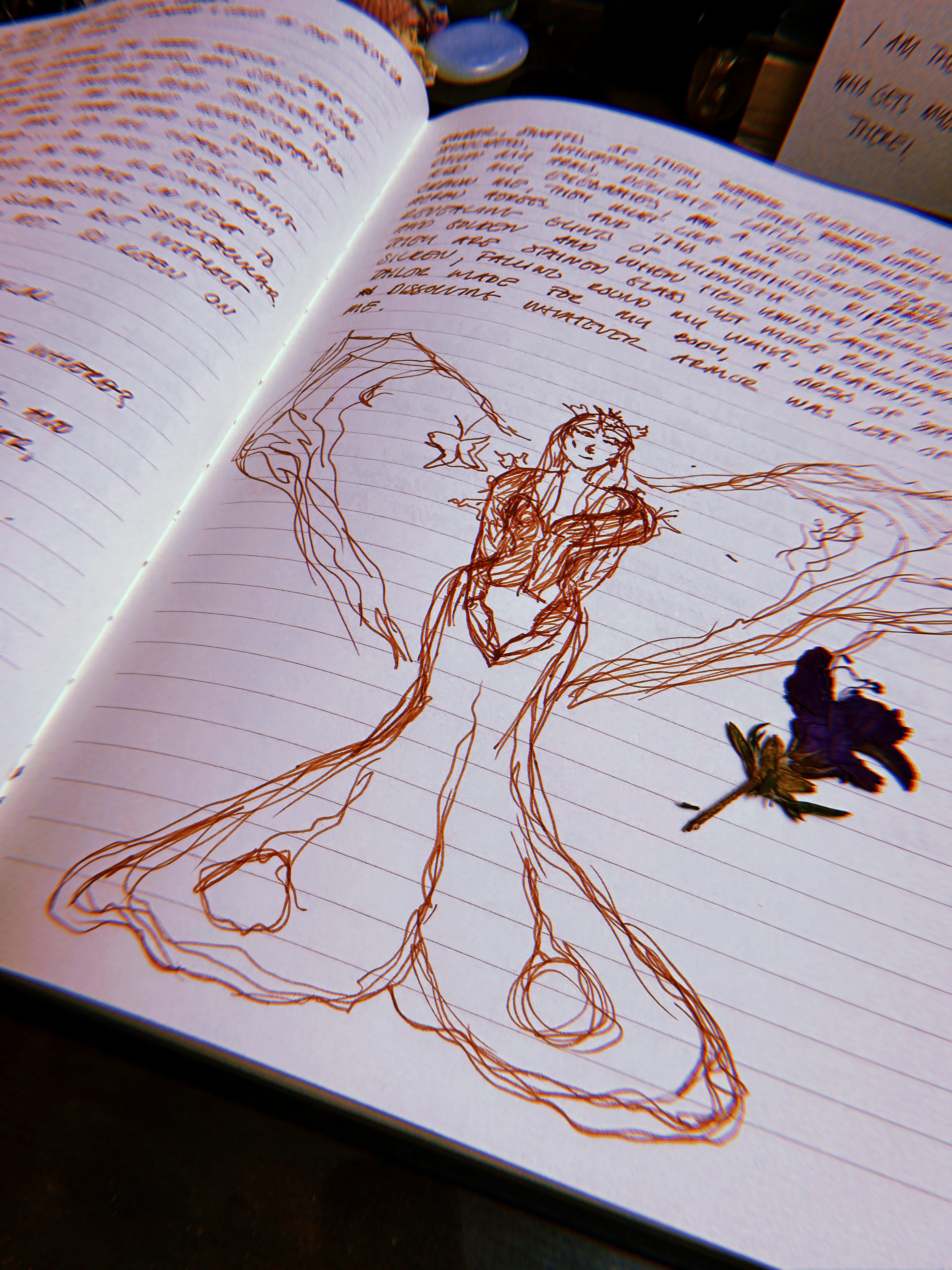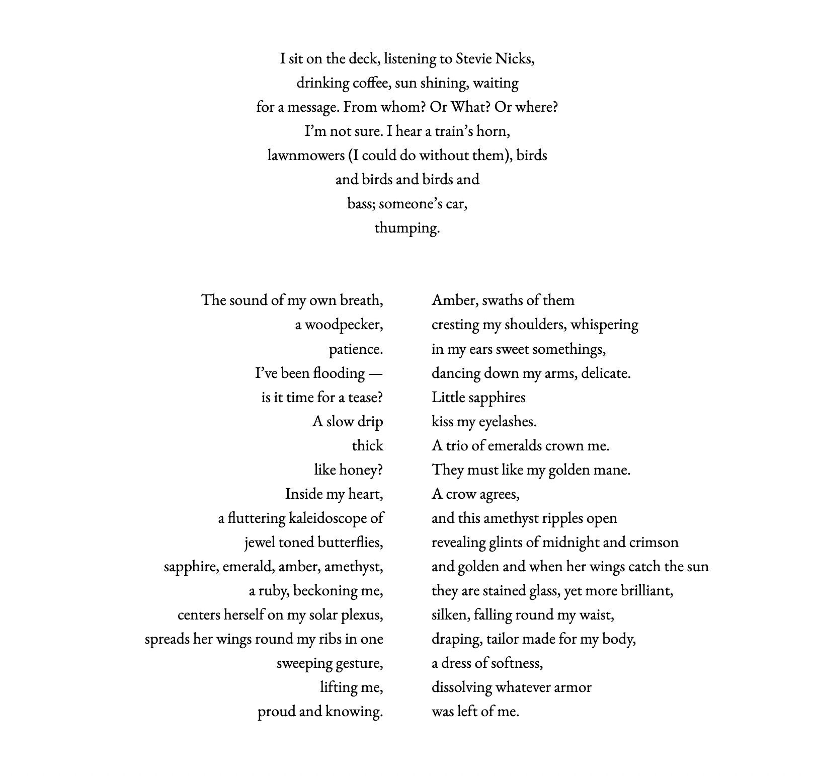 I sit on the deck, listening to Stevie Nicks, drinking coffee, sun shining, waiting for a message. From whom? Or What? Or where? I’m not sure. I hear a train’s horn, lawnmowers (I could do without them), birds and birds and birds and bass; someone’s car, thumping. The sound of my own breath, a woodpecker, patience. I’ve been flooding — is it time for a tease? A slow drip thick like honey? Inside my heart, a fluttering kaleidoscope of jewel toned butterflies, sapphire, emerald, amber, amethyst, a ruby, beckoning me, centers herself on my solar plexus, spreads her wings round my ribs in one sweeping gesture, lifting me, proud and knowing. Amber, swaths of them cresting my shoulders, whispering in my ears sweet somethings, dancing down my arms, delicate. Little sapphires kiss my eyelashes. A trio of emeralds crown me. They must like my golden mane. A crow agrees, and this amethyst ripples open revealing glints of midnight and crimson and golden and when her wings catch the sun they are stained glass, yet more brilliant, silken, falling round my waist, draping, tailor made for my body, a dress of softness, dissolving whatever armor was left of me.